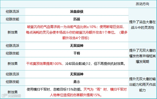 今天,官方放出了四月大改爆料人族篇,按照老规矩只有一半门派的部分内容。大唐有三处改动,浴血豪侠经脉能让破斧沉舟突破秒三上限,只要使用灵元技能巨剑后,就能多打一个目标。另外两个则是无双战神,不仅提高干将法宝的输出爆发能力,还能在雨天增加输出伤害。
