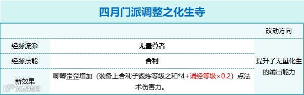 化生寺的法系玩法得到加强,能让装备的舍利子增加法伤,效果与门派技能挂钩。