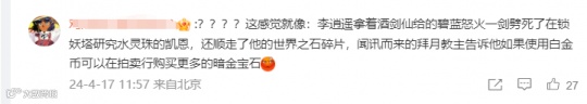 官博评论区,点赞量最高的网友就表示:“感觉就像李逍遥拿着酒剑仙给的碧蓝怒火一剑劈死了在锁妖塔研究水灵珠的凯恩,还顺走了他的世界之石碎片,闻讯而来的拜月教主告诉他如果使用白金币可以在拍卖行购买更多的暗金宝石。”