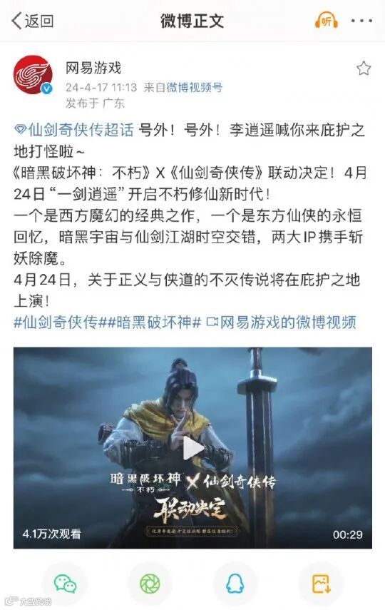 网易游戏在微博中喊话:“李逍遥喊你来庇护之地打怪啦~《暗黑破坏神:不朽》X《仙剑奇侠传》联动决定!4月24日“一剑逍遥”开启不朽修仙新时代!一个是西方魔幻的经典之作,一个是东方仙侠的永恒回忆,暗黑宇宙与仙剑江湖时空交错,两大IP携手斩妖除魔。”