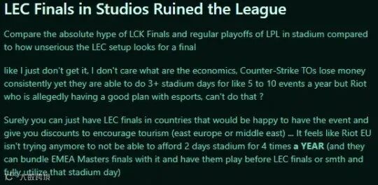 欧服作为英雄联盟电竞最早兴起的地方,有着大批忠实粉丝。可是在多年的发展过程中,LEC却渐渐成为了“第三赛区”,收入和举办比赛的预算不断下降。到今年春季赛期间,官方甚至还进行了大规模裁员。即便是春决这样的重要赛事,也没有专门租赁线下场馆。