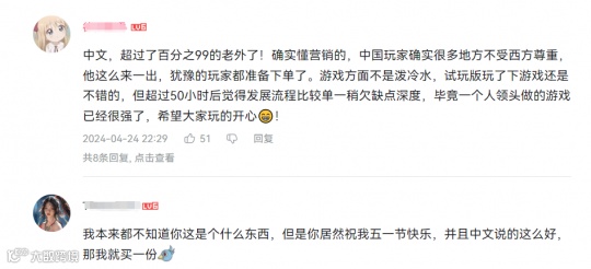 而一款拥有汉化文本的游戏+一个会说中文的发行商致辞,使得被攻击到软肋的中国玩家不得不掏腰包了。很多网友表示冲着这份诚意,也得支持一波。