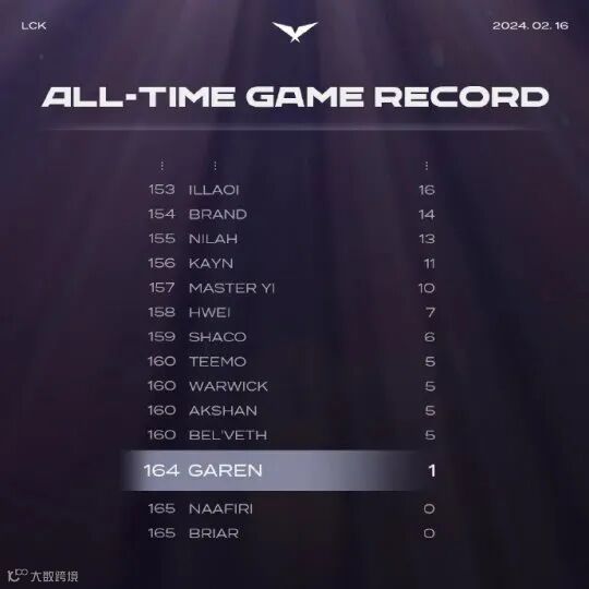 作为英雄联盟游戏的初始英雄之一,盖伦以简单粗暴著称。不过在职业赛场上,他却鲜有出场。历经十多年,直到本次的LCK春季赛中盖伦才有了首次的选用数据。至此,LCK的历史数据榜单中,仅剩两位英雄没有过出场记录,而他们分别是纳亚菲利和贝蕾亚。