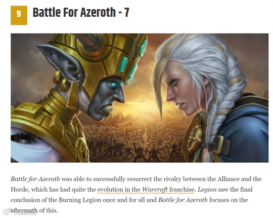 同时,外媒对于8.0争霸艾泽拉斯的评价也很低,他们觉得游戏前期的剧情故事不错,但在进入中后期时,暴雪失去了对整个故事线的掌控力,崩坏了大量的人物形象,故而只值7分。