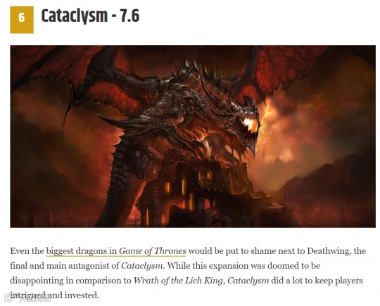 抛开9.0跟8.0这两个比较垃圾的资料片不谈,外媒对于4.0与5.0的评价与国服玩家产生了不少的分歧。他们认为4.0剧情十分富有史诗感,并新增了幻化系统,让玩家得以DIY自己角色的外观,这是值得4.0大灾变拿到7.6分的高分,排在第六名的位置。