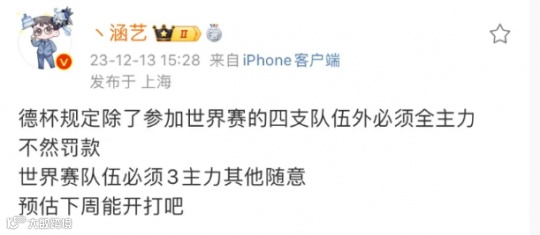 作为休赛期联盟最大的消息来源,前V5教练涵艺爆料了一些关于本届德杯的细节——除参加世界赛的四支队伍外,必须全主力上场;世界赛队伍也必须保证三名主力选手登场,预计下周就会开赛。