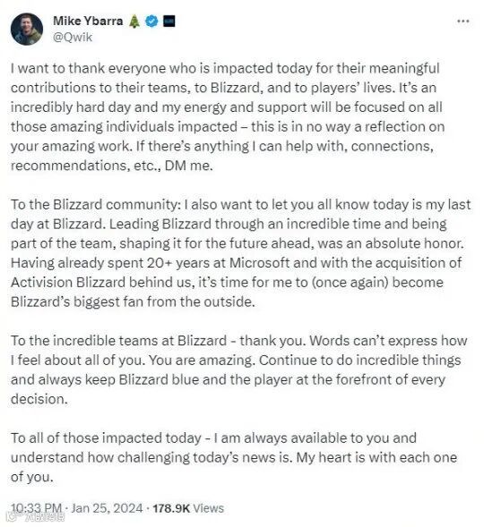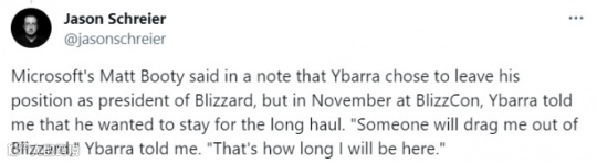 需要提到的一点是,知名舅舅党 Jason Schreier在个人动态中暗示暴雪总裁Mike Ybarra的辞职并非自愿,而是来源于外部压力。对于这个消息,WindowsCentral的编辑Jez Corden表达了肯定。而后者的另一个身份,就是暴雪总裁Mike Ybarra的好友。