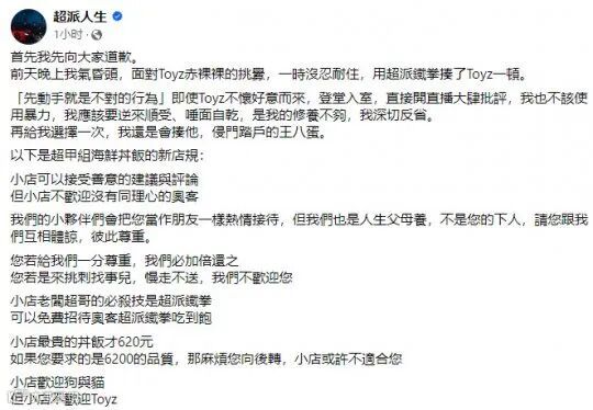 事后网红超哥发布了动态,回应了这起事件。不过文中虽然提到了道歉,但面向的却是观众而非Toyz。超哥表示“先动手就是不对的行为”,后面却话锋一转“再给我选择一次我还是会揍他。”