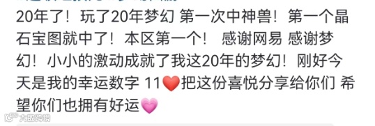 这位小伙伴04年接触梦幻,算是骨灰级老玩家了。命运更加神奇的是,11是小伙伴的幸运数字,刚好在昨天(11号)一发入魂超级红孩儿,这波经历估计终身难忘!