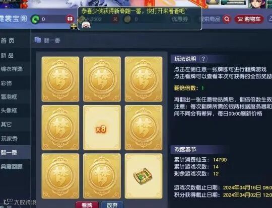 近日,有位玩家在开启“新春翻一番”后,直接收获了8本高级魔兽要诀。虽然还没查看结果,但这样的好运气属实令人羡慕。小编觉得,大家确实可以趁着“新春翻一番”的活动消费自己期盼已久的仙玉商品,月卡仙玉多的小伙伴也可以买点秘制红蓝。毕竟,今年“新春翻一番”消耗的是梦幻币!