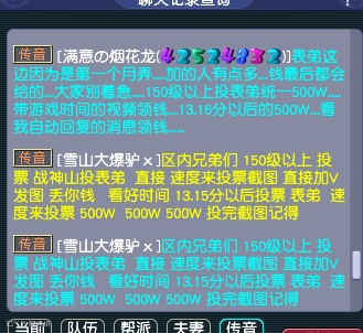 前段时间,沂水雪山服战队解散后,区内服战权的归属也成为了“雪山大舞台”的竞争重点。这不,表弟和平头就在今日上演了一出“买票大战”。根据传音内容,150级以上的玩家投票就可以获得500W,这要是一组号那岂不是2500W?下面,就让小编带大家去看看今天的梦幻新鲜事吧!