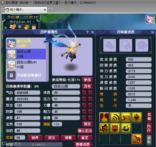 这次新资料片官方新增了多只召唤兽,其中就有化圣携带的自在心猿。由于自在心猿造型帅气,有位高玩实在忍不住,直接找测试区的朋友借了个号,火速炼妖一只7技能须弥心猿,而且后续打书也非常成功。这只宝宝不仅主书不缺,还有高敏和高感知,用来刷日常任务直接起飞!