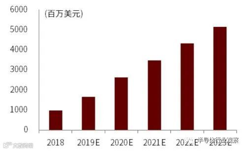 因此,FPGA 芯片在矩阵运算、图像处理、机器学习、非对称加密、搜索排序等人工智能领域有着很广阔的应用前景。Semico Research预测,FPGA在人工智能领域的市场规模2023年有望达52亿美元,五年复合增速38.4%。