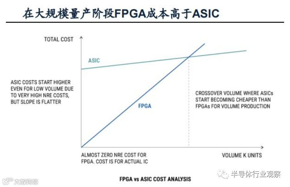 基于设计灵活、兼容性强、并行计算、适用性强等特点,FPGA芯片被广泛应用在智能设备中。早期,因无需高额流片即可验证芯片产品,在量产初期或者开展研发类项目,FPGA的性价比优势最为明显,在部分应用场景可实现对ASIC的部分替代。但当量产规模提升后,FPGA的性能优势以及成本优势反而下降,且该时期内FPGA的传统优势反而对产品及市场推广意义较低,因此该时期OEM厂商通常会使用ASIC。