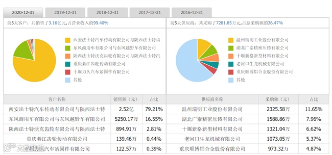 截至2020年报,公司前五大客户占比达到96.43%,知名客户如法士特、东风商用车等。而作为占中型、重型卡车变速箱85%以上份额的法士特公司,2020年重型变速箱的总计划量安排110万台以上,而法士特公司是公司的最大客户,订单及产品产量或将会有较大幅度的提升。