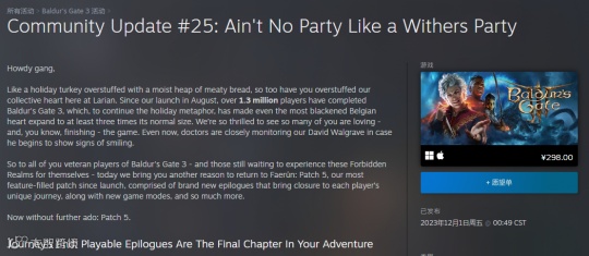 《博德之门3》此次的更新不可谓不丰富,光是新增后记故事可玩章节这一项,其实就可以当成DLC内容来卖了。据悉,后记故事为最终战6个月之后,同伴们将重新聚在一起,互相交流各自经历的故事。起源角色们都会换上新服装,邮箱里还有许多老朋友的来信。