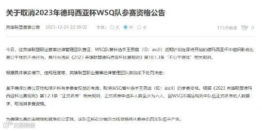 官方公告显示:经英雄联盟职业赛事纪律管理团队查证,WSQ队替补选手王思琪(ID:ascii)近期计划在即将开始的德玛西亚杯中组织影响比赛公平性的不当行为,其行为违反《2023 英雄联盟德玛西亚杯比赛规则》第10.1.1条“不公平游戏”相关规则。