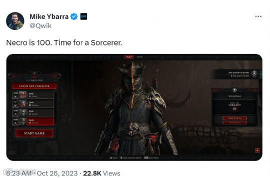《暗黑破坏神4》第二赛季的更新现已过去一周,相信有不少玩家都已升到了满级。在调整经验计算方式后,玩家们的升级之路变得平坦了许多。就连暴雪总裁Ybarra,今日也晒出了一张他自己的《暗黑破坏神4》游戏截图,并表示他的死灵角色已在第二赛季达到满级。