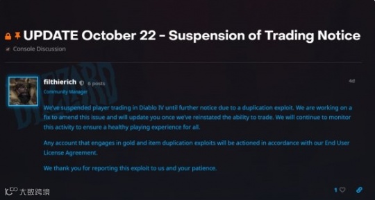 早在本周一《暗黑破坏神4》就因为复制装备BUG的出现,暂停了交易系统的进行。经过后续几天的进一步处理,情况终于有了变化。对于那些复制“都瑞尔门票”、“无限刷暗金”的玩家,暴雪予以了严肃处理。