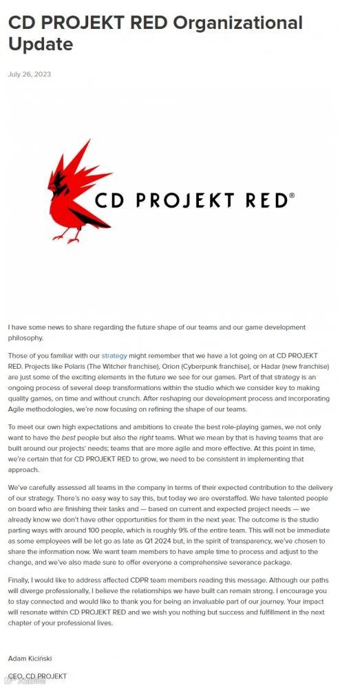 “PGWU”诞生的原因,最早得追溯到今年7月份。当时,CDPR认为员工过剩,开启了裁员行动。这场裁员计划到2024年第一季度时,解雇9%的公司员工。截止到目前,CDPR的裁员工作已经进行到了第三轮。