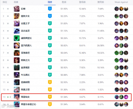 由于数值过于拉胯,当前版本风女在韩服只有4.3%的出场率,属于T3级别的英雄。本赛季除了WE的Iwandy使用过,在其他赛区基本没有登场记录。对于这个英雄联盟游戏的元老级英雄,设计师或许该考虑打捞一下了。