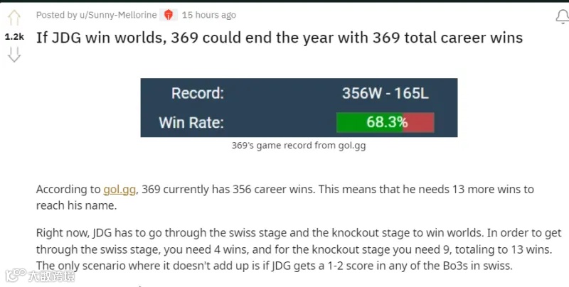 面对明日就将开启的瑞士轮,外网Reddit的网友发现了一个特别的巧合——如果JDG夺冠的话,369将以369个胜场夺冠。