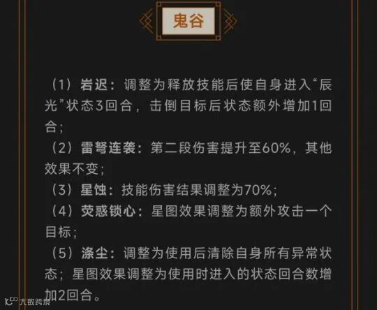 【鬼谷】岩迟调整为释放技能后使自身进入“辰光”状态3回合,击倒目标后状态额外增加1回合;涤尘:调整为使用后清除自身所有异常状态;星图效果调整为使用时进入的状态回合数增加2回合。