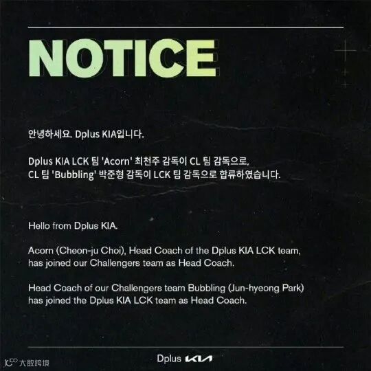 DK输给GEN之后,官方在昨日突然发布了新的人员调整公告——原教练Acorn去担任二队教练;二队教练Bubbling教练指导LCK。