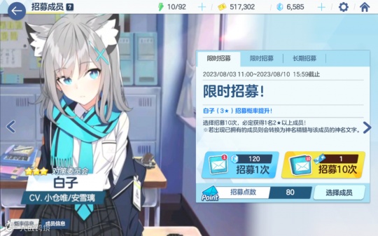先从简单的抽卡开始说起,与PCR类似,玩家在卡池中抽到同名角色会变为碎片,三星概率为3%,十连必出2星,一井为200抽。游戏开局赠送的十连可以重置10次,整体来说游戏的开局福利还是可以的,只是后续章节中能薅的羊毛比较少,外服的福利基本全靠维护,国服只能看看后续的活动中策划会怎么操作了。