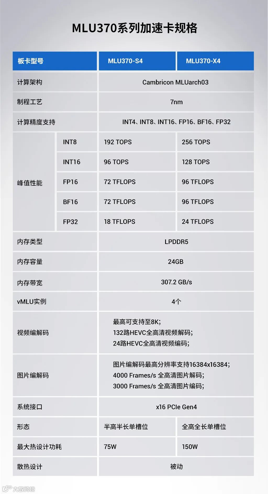 ▲ MLU370-S4、MLU370-X4加速卡规格
