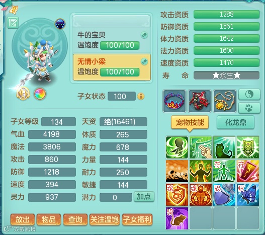 《神武5》大改以后的子女技能是四选二,建议漫天狂沙+蚀骨烈焰。