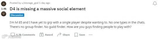 然而当玩家不断追寻着某个目标,等级达到某个层次后,难免会开始思考这一切是否合理。近来外网针对《暗黑4》玩法向的讨论中,就出现了关于游戏社交属性的内容。一位玩家所提出的“《暗黑4》缺乏社交玩法”的问题,就引发了许多人的共鸣。