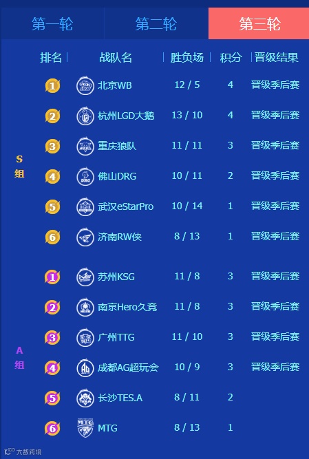 常规赛第二轮,北京WB的发挥可谓十分稳定,轻松拿到S组第二的好成绩。进入第三轮后,北京WB更是以仅负5场胜12场的骄人战绩,以S组第一名的身份成功挺进季后赛,面对绝大多数的对手都展示出了游刃有余的实力。