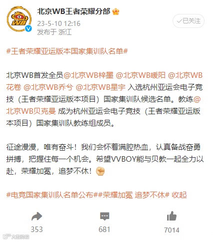 不久前,北京WB全部首发队员,北京WB.梓墨 、北京WB.暖阳、北京WB.花卷、北京WB.乔兮、北京WB.星宇,成功入选杭州亚运会电子竞技(王者荣耀亚运版本项目)国家集训队候选名单。与此同时,北京WB教练贝克曼,也成为杭州亚运会电子竞技(王者荣耀亚运版本项目)国家集训队的教练组成员。