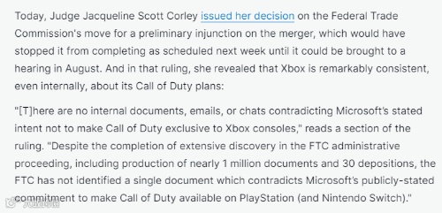 微软管理层在法庭上宣誓,没有计划让《COD》系列成为独占游戏的打算。同时根据微软的战略布局,他们也是将《COD》系列继续登陆PS平台考虑在内的。当然,最重要的一点还是过去从未有过像《COD》系列这样的大体量游戏,被某个平台独占的先例。
