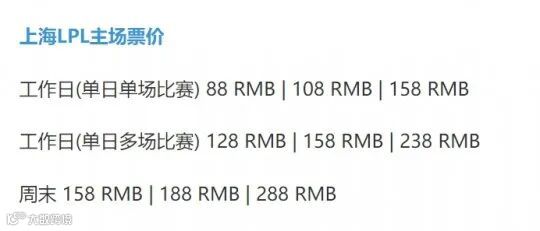 根据LPL赛区上海主场的票价,平时工作日的票价区间为88RMB——238RMB不等。