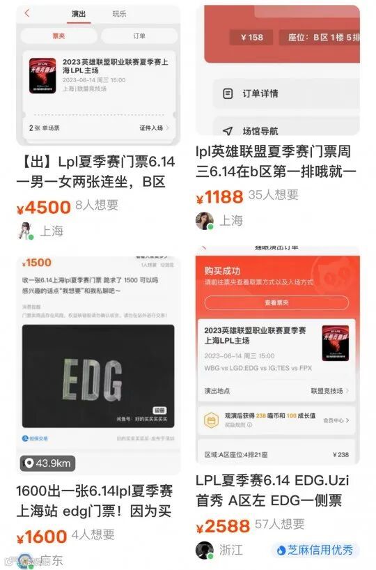 然而在各大网络交易平台,当前EDGvsIG的比赛票价,已经被炒到了1188RMB——2588RMB。超10倍的票价波动,甚至已经赶超一些歌星的演唱会门票。但这也在一定程度上,解释了EDG管理层愿意签下这位已经一年没打比赛的老将的原因。