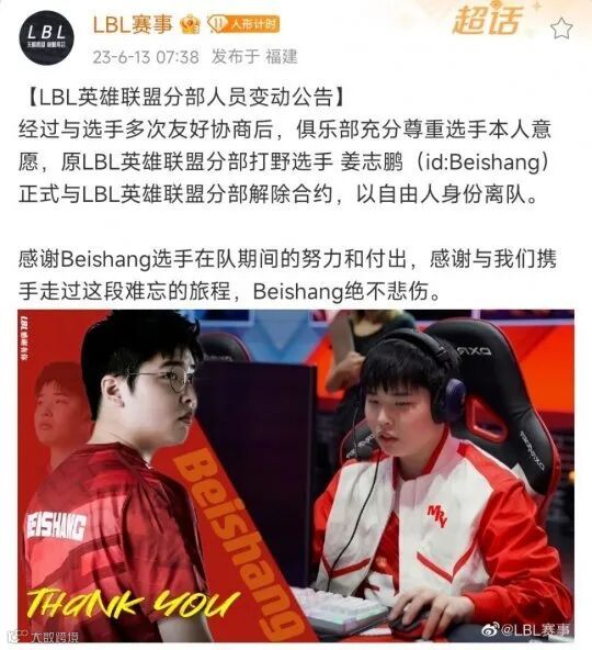 最近几天LPL赛区的人员转会消息爆料,比休赛期更为频繁。继Uzi复出加入EDG的事件尘埃落定后,前WE打野Beishang日前也被曝出即将复出。Doinb组织的LBL官博于今早,官宣了Beishang离队的消息,这跟之前Uzi复出前的预热流程如出一辙。
