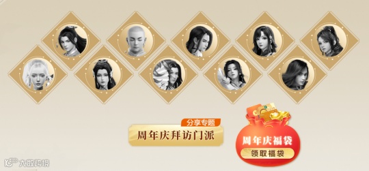 这个活动就更简单了,《梦幻新诛仙》两周年推出了全新门派天道府,目前一共有十大门派,你只要点击周年庆拜访门派,分享叶子猪活动页面,就可以点亮每一个门派头像。