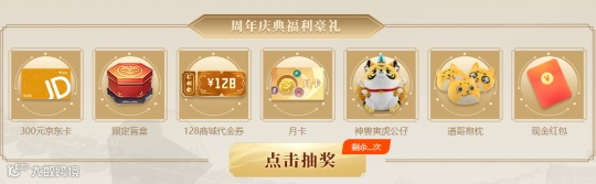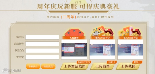 上传礼包激活截图,是必得随机周年庆红包(价值2~648元),角色评分抽奖必中奖品(300元京东卡、100元京东卡、月卡抱枕等),奖品是先到先得,领完为止哦!
