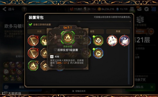 最后就是欧多马顿塔,每周一次的肉鸽爬塔,每层通关可以获得丰厚的奖励和随机的强化装置用于提升队伍能力,欧多马顿塔分为五个阶段,通关当前阶段就可以攻略下一阶段。觉得本次装置不够强力或者卡关了可以选择重置阶段重新爬塔获得新的装置,但只有三次机会,奖励也同样非常丰厚。