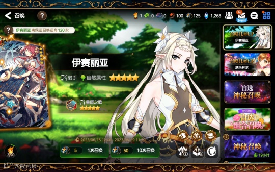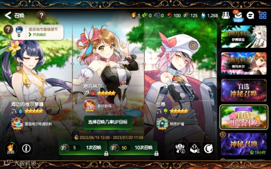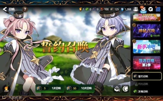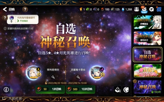 而特化的卡池就比较丰富了,首先就是三合一卡池,在这一池子中玩家可以选择三个自己需要或是喜欢的角色作为概率提升角色,不过没有保底,出5星的概率为2.75%,能不能出全凭运气。然后就是神秘召唤,神秘召唤主要针对月光角色,消耗的是神秘奖牌,每一期卡池有两位五星英雄UP,保底200抽,第201抽必出月光五星英雄,保底可留到下一卡池。另一个则是月光召唤,消耗银河书签抽取,20抽会有一次保底。
