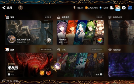 第二就是深渊,用现在流行的话说就是一个爬塔的玩法。奖励非常丰厚,目前有120层。深渊进入需要门票深渊帮手β,门票每天会补充三个,可以消耗3个门票获得净化奖励。最主要的还有挑战模式,需要玩家普通模式打到80层才开启,届时会有更强的敌人,更丰富的奖励。