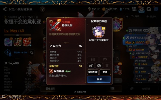 装备养成则着重在套装与词条上,用现在比较容易理解的说法就是圣遗物,每个套装都有不同的效果,每个英雄可以穿六件装备,套装有分别有4件套和2件套,也就是说大家可以4+2,也可以2+2+2。词条属性也是相当重要,刷到装备时会有随机的词条属性,神级装备可遇不可求,强化装备时会随机提升一个词条属性,也是一个运气活。