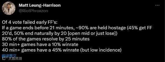 此外,面对十五分钟发起的投降你如果点了否,那么还是会有45%的对局会在二十分钟结束,另外50%的情况会被中推或者以各种方式输掉。对于坚决不投降的玩家来说,拖到二十分钟的好消息是,获胜概率确实变高了;但坏消息是,这个概率只是从3%提升到了5%。