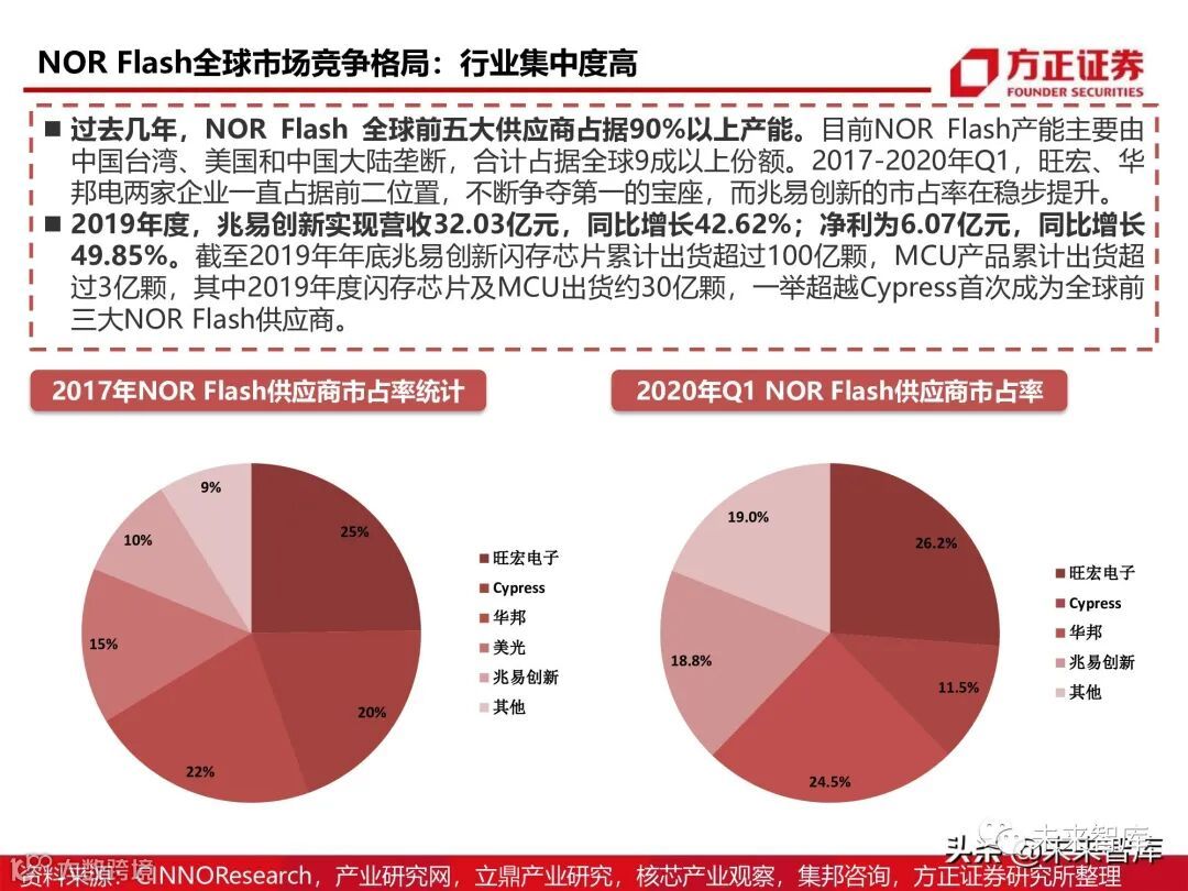从2010年开始,NOR Flash市场经历了数次洗、牌,2017年,Cypress和美光均宣布退出低端NOR Flash市 场,之后便形成了持续至今的五强竞争格局,然而这种格局在今年已经开始快速变化。2019Q2,兆易创 新市场份额首度超越美光成为全球第四大NOR Flash供应商,2019Q3又接着超越Cypress成为全球第三, 并在2020年Q1维持全球第三的市占率。