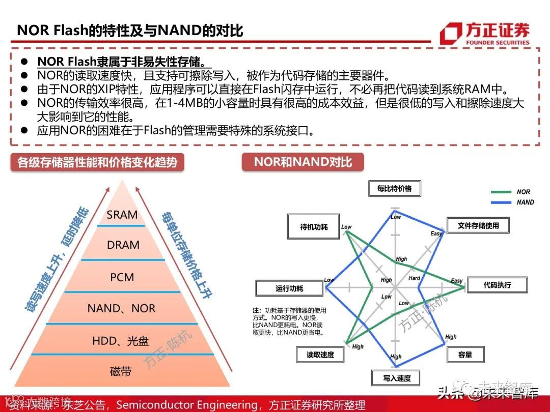 。但因NOR偏重于性能和可靠性,而不具备成本优势等差异,导致NAND成为主 流的大容量数据存储器,NOR主要应用于系统启动代码和特定只读信息系的存储,属于利基型存储市场。