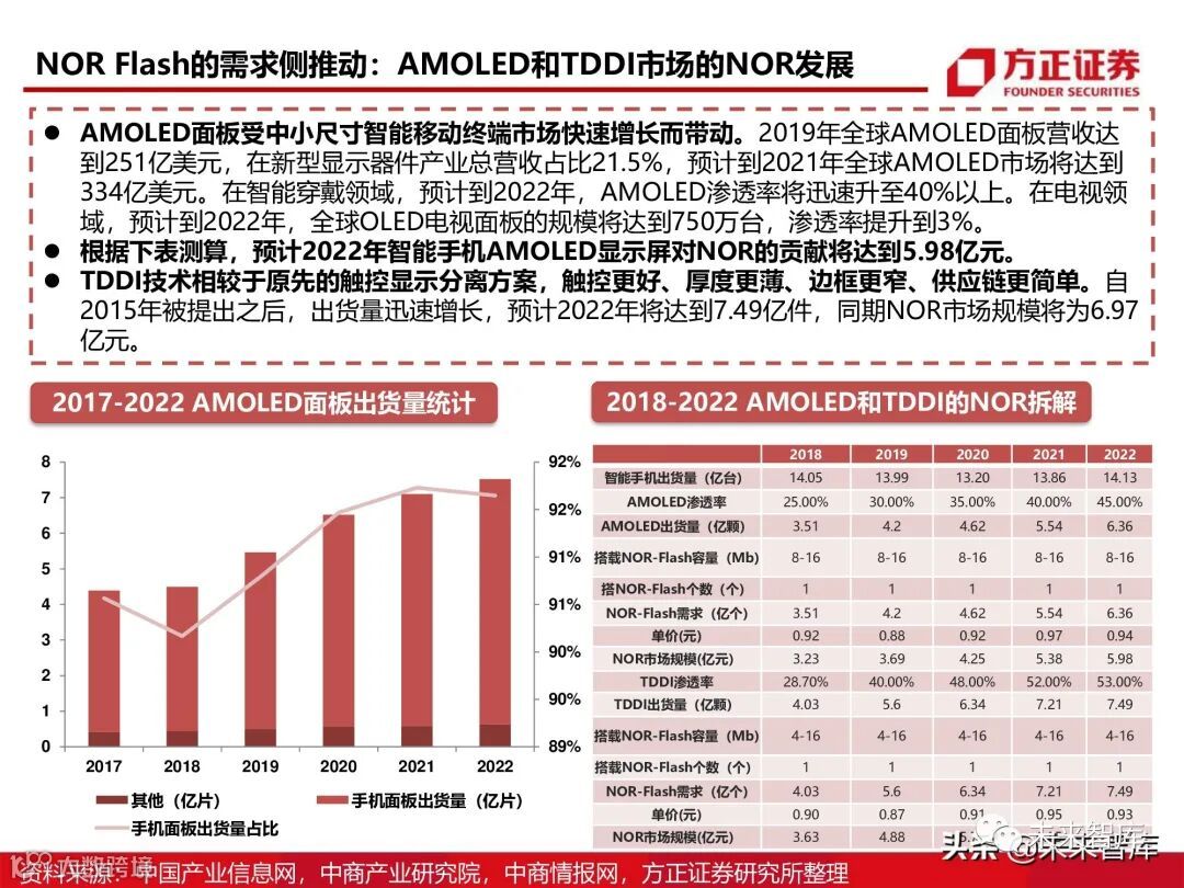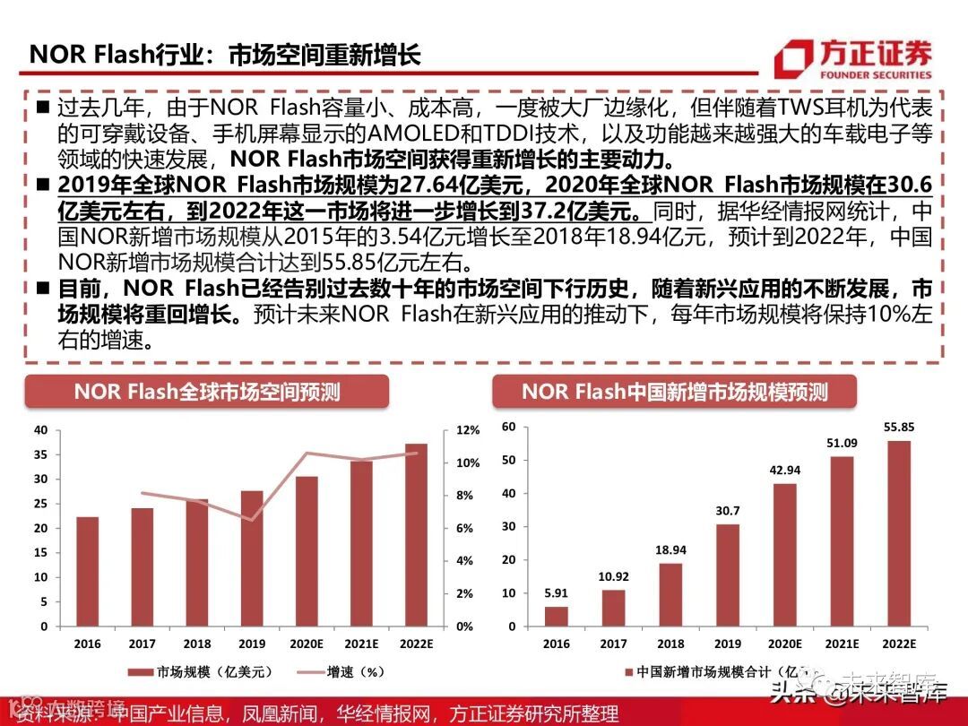 主板BIOS、数字机顶盒、家庭网关、路由器、loT、汽 车电子、穿戴式设备、安防监控、人工智能等领域的代码存储媒介中都有NOR。其中,智能穿戴、AMOLED屏、 手机摄像、loT设备、汽车电子、5G基站、增强现实、虚拟现实具备较大增长空间。