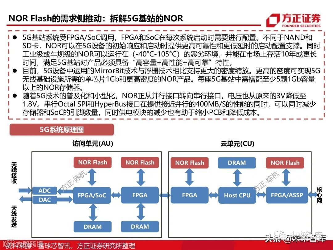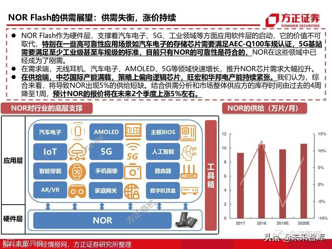 NOR Flash作为硬件层,支撑着汽车电子、5G、工业领域等方面应用软件层的启动,它的价值不可 取代,