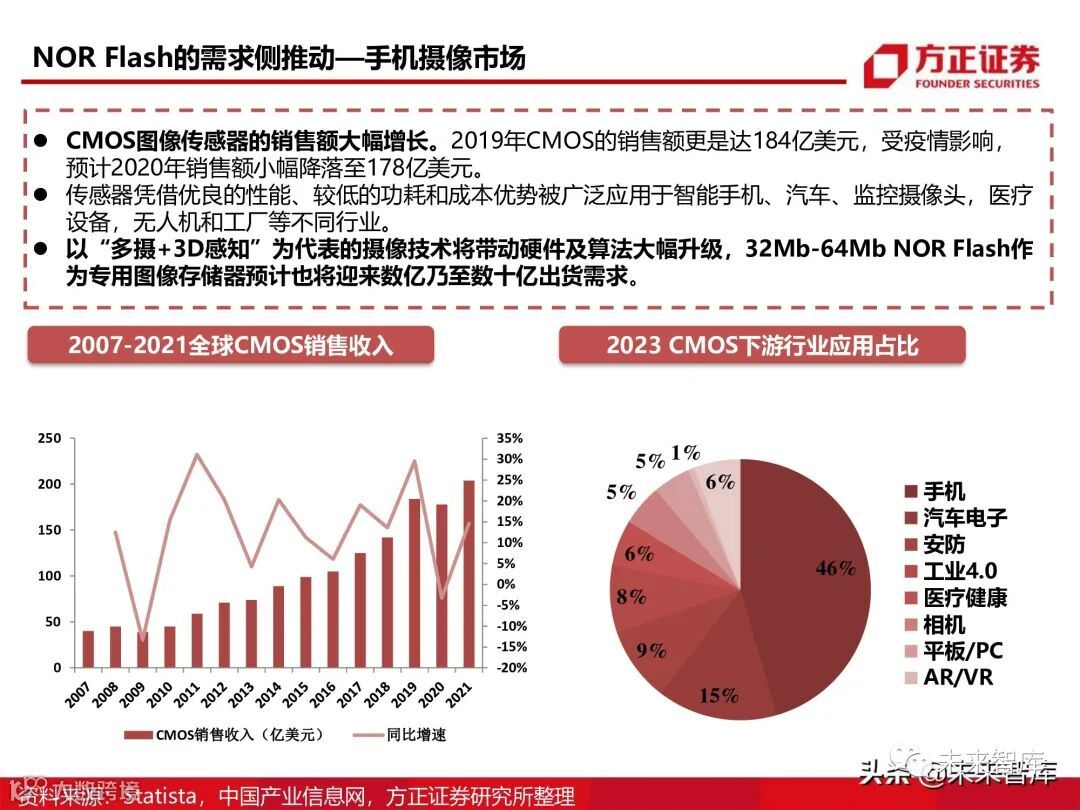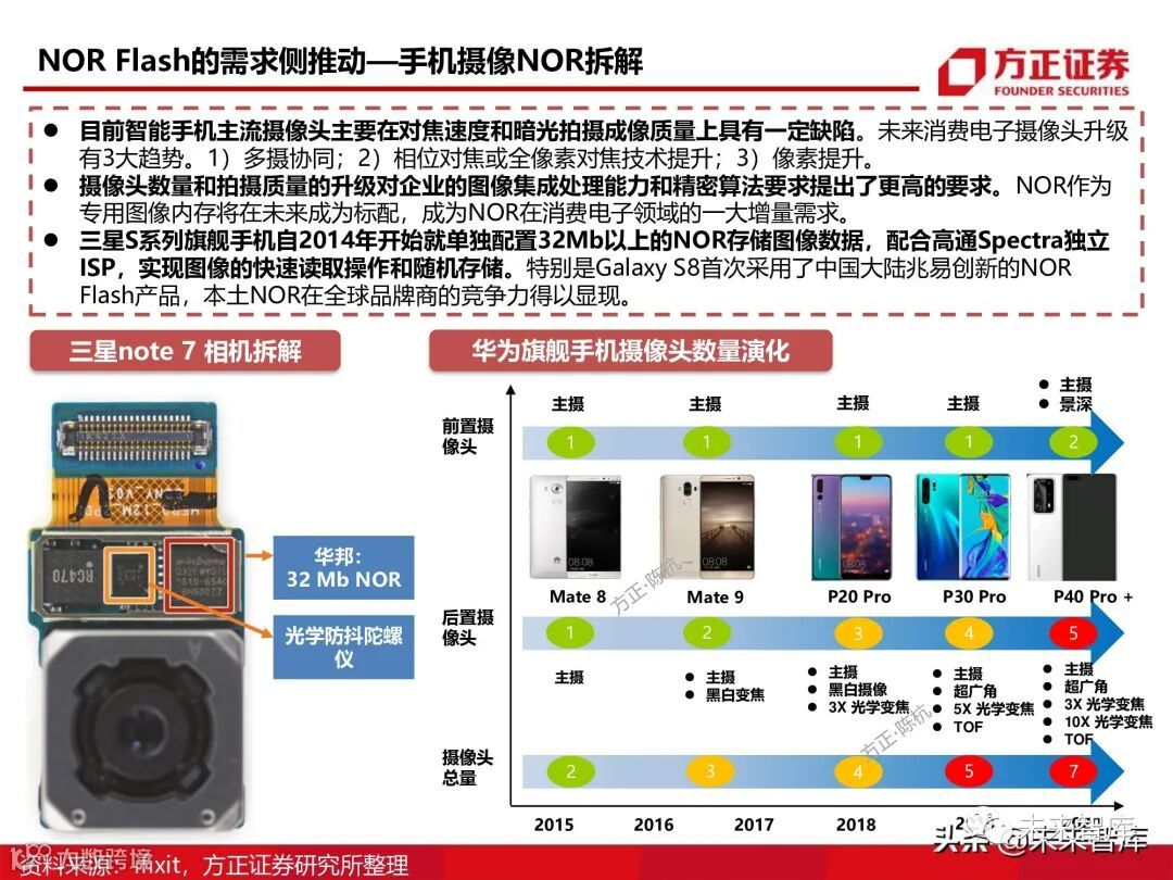 未来消费电子摄像头升级 有3大趋势。1)多摄协同;2)相位对焦或全像素对焦技术提升;3)像素提升。摄像头数量和拍摄质量的升级对企业的图像集成处理能力和精密算法要求提出了更高的要求。NOR作为 专用图像内存将在未来成为标配,成为NOR在消费电子领域的一大增量需求。